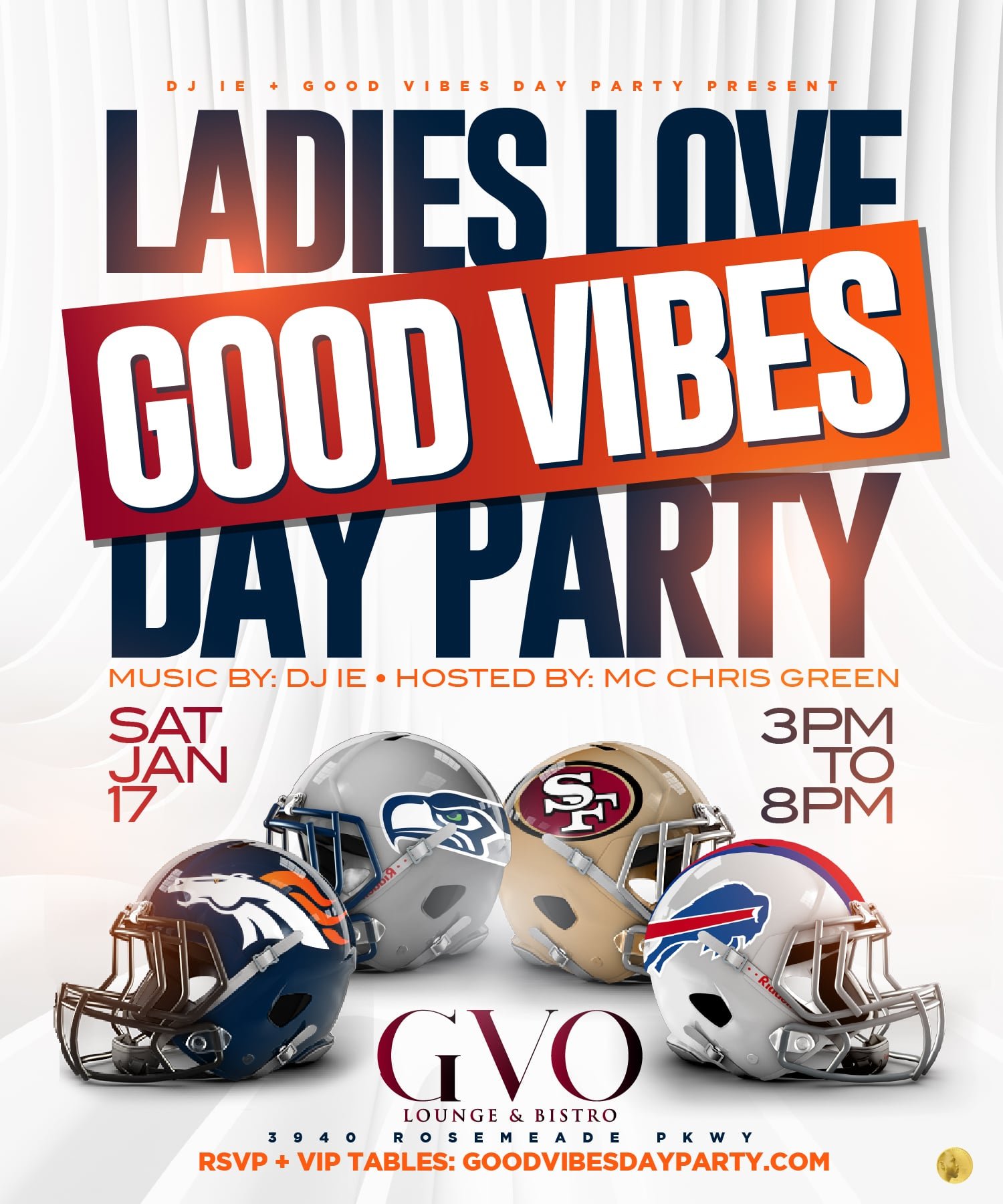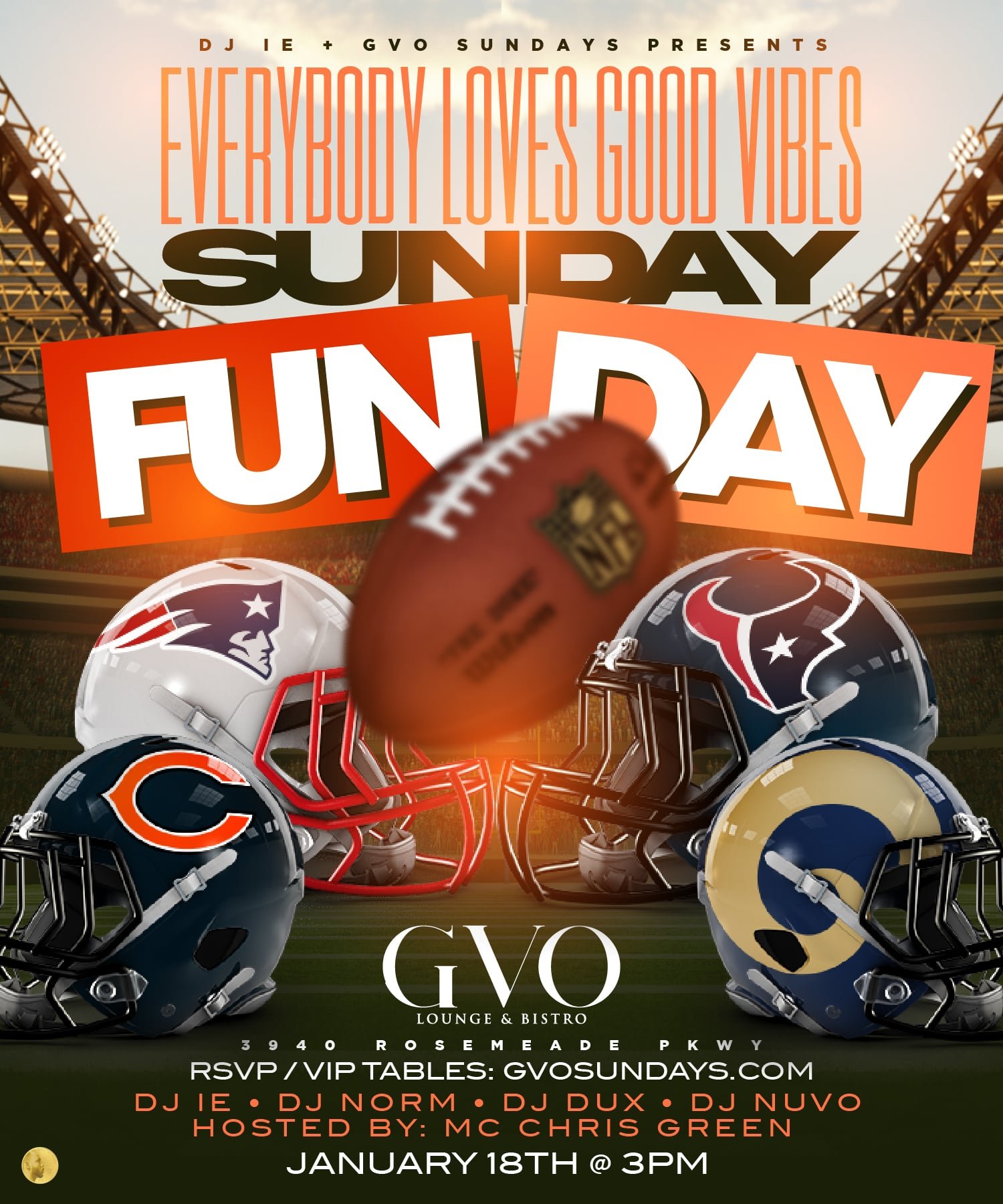 EVENTS WEEKEND WARM-UP HAPPY HOUR THURSDAYS @ THE ALLEY CLICK HERE FOR TICKETS & VIP TABLES GOOD VIBES DAY PARTY EVERY SATURDAY @ GVO CLICK HERE FOR TICKETS & VIP TABLES BACK 2 THE YARD SAT NITE JAN 17 @ SAINT ROCCOS CLICK HERE FOR TICKETS & VIP TABLES GOOD VIBES SUNDAY FUNDAY EVERY SUNDAY @ GVO CLICK HERE FOR TICKETS & VIP TABLES
